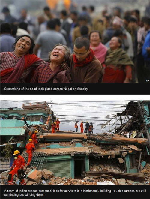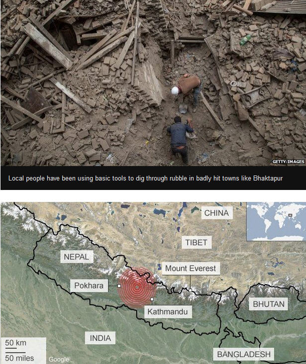 គួរបញ្ជាក់ថា ក្រុមមនុស្សរាប់ពាន់នាក់ បានចំនាយពេលដល់ទៅ ២ យប់ នៅខាងក្រៅ បន្ទាប់ពីគ្រោះ រញ្ជួយដី កម្លាំង ៧,៨ រ៉ិចទ័រ ធ្វើអោយមានករណីបាក់រលំផ្ទាំងទឹកកក ភ្នំ Mount Everest ជាដើម មន្រ្តី ផ្លូវការ ព្រមានអោយដឹងថា តួរលេខជនរងគ្រោះ ស្លាប់បាត់បង់ជីវិត អាចនឹងមានការកើន ឡើង ស្រប ពេល ដែល ក្រុម ជួយសង្គ្រោះបានធ្វើដំណើរដល់ តំបន់ ភ្នំ ដាច់ ស្រយាល ភាគខាងលិច ប្រទេស នេប៉ាល់ ។ របាយការណ៍ដំបូងលើក ឡើង អោយដឹងថា បណ្តាសហគមន៍ជាច្រើន ជាពិសេស សហ គមន៍ដែលមាននៅវត្តមាន នៅជិតតំបន់ភ្នំ បានទទួលរងនូវឥទ្ធិពលអាក្រក់ខ្លាំងជាងគេ។