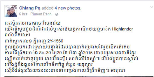 ភ្នំពេញ៖ ម្ចាស់ដេប៉ូស្ថានីយសាំងតេឡាមួយកន្លែង នៅខណ្ឌពោធិ៍សែនជ័យ រាជធានីភ្នំពេញ បានប្រកាសនៅលើទំព័រ Facebook របស់ខ្លួន អំពាវនាវឱ្យម្ចាស់រថយន្ត Highlander ពណ៌ទឹកមាស ពាក់ស្លាកលេខ ភ្នំពេញ 2Y-1560 ចូលខ្លួនដោះស្រាយជាបន្ទាន់ ក្រោយពេលដែលម្ចាស់រថយន្តនេះ ចាក់សាំងហើយមិនឱ្យលុយ រួចបើករថយន្តគេចខ្លួនទៅបាត់។