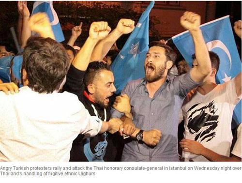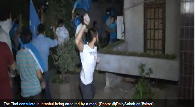 ក្រុមបាតុករ ទួរគី បានប្រើប្រាស់ ដំបង ដុំថ្ម គប់កំទេចទ្វារ បង្អួច ស្ថានកុងស៊ូលថៃនាយប់ថ្ងៃពុធដោយ បន្តលុកលុយ និងរើកកាយសំណង់អាគារ ខណៈរើជជុះ រាល់របស់របរទាំងអស់ ទៅនឹងដីខណៈសកម្ម ភាពទាំងអស់នេះ ត្រូវបានគេមើលឃើញជាក់ស្តែង តាមរយៈឃ្លីបវីដេអូ ពីសារព័ត៌មានក្នុងស្រុក ។ គួរ បញ្ជាក់ថា ជនជាតិ Uighurs រាប់ពាន់នាក់ បានរត់ភៀសខ្លួនចេញពី ភាពចលាចល ក្នុងតំបន់ Xinjiang ភាគខាងលិច ប្រទេសចិន ដែលទីនោះផ្ទាល់ មនុស្សរាប់រយនាក់ ប្រឈមនឹងការសម្លាប់ខណៈជម្រុញ អោយមានការបង្រ្កាប ពីអាជ្ញាធរចិន ។ ជនជាតិ Uighurs ប្រឈមក្នុងការធ្វើដំណើរ ដោយ លួចលាក់ និង ខុសច្បាប់ នៅទូទាំងប្រទេស តំបន់អាស៊ីភាគអាគ្នេយ៍ ឆ្ពោះទៅកាន់ ប្រទេស ទួរគី វិញ គួរបញ្ជាក់ ថា ចិនគឺជាប្រទេសមួយ ដែលប្រជុំទៅដោយ ជនជាតិ ដើម ភាគតិច ម៉ូស្លឹម ដល់ទៅ ២០ លាននាក់ ក្នុងនោះ មួយភាគ គឺជាវត្តមាន ជនជាតដើមភាគតិច Uighur ផ្ទាល់តែម្តង ៕