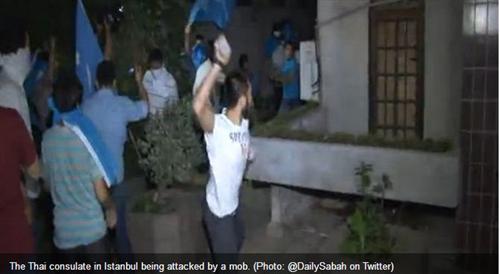 ព័ត៌មានអន្តរជាតិ ៖ ប្រជាជនទួរគី ដែលជាក្រុមផ្ទុះការតវ៉ានោះ បានធ្វើការវាយ ប្រហារ មួយយប់ពេញ យប់ថ្ងៃពុធ ទៅលើស្ថានកុងស៊ូល ប្រទេសថៃ ប្រចាំទីក្រុង Istanbul ប្រទេស ទួរគី ដោយធ្វើការវាយប្រ ហារបំបែកកញ្ជក់ និងកម្ទេច ក៏ដូចជា រុះរើ កកាយ សំណង់អាគារ ជាដើម ពាក់ព័ន្ធ ទៅនឹងការតវ៉ា ប្រ ឆាំងទៅនឹងប្រទេសថៃ ទៅលើការធ្វើបត្យាប័ន ជនជាតិដើមភាគ តិច ម៉ូស្លឹម Uighur ទៅកាន់ប្រទេស ចិនវិញ ។