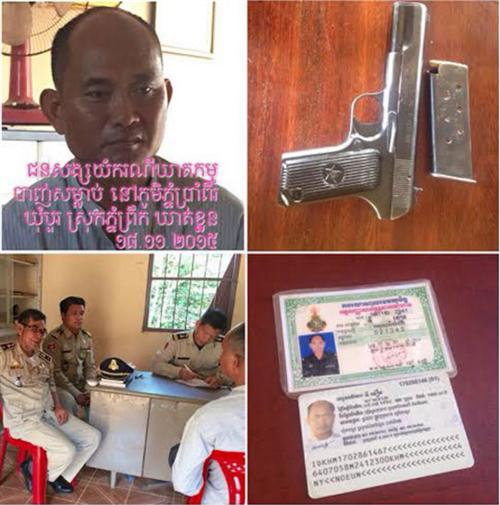 បាត់ដំបង៖ ក្រោយពីមានការតាមដាន ស្រាវជ្រាវរបស់សម្ថកិច្ចនគរបាល អស់រយ:ពេល០៦ថ្ងៃមកនេះ ករណីឃាតកម្មបាញ់សម្លាប់ មន្ត្រីយោធាម្នាក់ បណ្តាលឱ្យស្លាប់បាត់បង់ជីវិត កាលពីថ្ងៃទី១៤ ខែវិច្ឆិកា ឆ្នាំ២០១៥ កន្លងទៅ ចំណុចភូមិភ្នំប្រាំពីរ ឃុំបួរ ស្រុកភ្នំព្រឹក ខេត្តបាត់ដំបង រហូតមកដល់ព្រឹកថ្ងៃទី១៩ ខែវិច្ឆិកា ឆ្នាំ២០១៥ នេះ សមត្ថកិច្ចចាប់បានជនដៃដល់ហើយ។