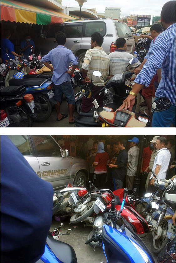 ភ្នំពេញ៖ បុរសវ័យចំណាស់ម្នាក់ ចេញពីផ្សារថ្មីឡើងជិះរថយន្តឡង់គ្រីស័ររបស់ខ្លួន ចេញពីខាងត្បូងផ្សារ ស្រាប់តែ ច្រឡំជាន់ហ្គា ថាជាហ្រ្វាំង បានស្ទុះចូលទៅបុករះម៉ូតូអស់ជាង ១០គ្រឿង ព្រមទាំងបុកស្រ្តីម្នាក់ថែមទៀត តែរង របួសមិនធ្ងន់ធ្ងរនោះទេ។