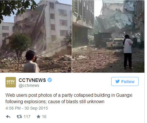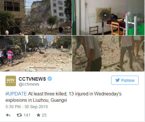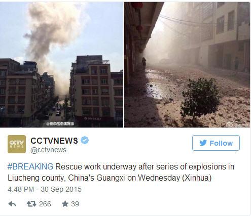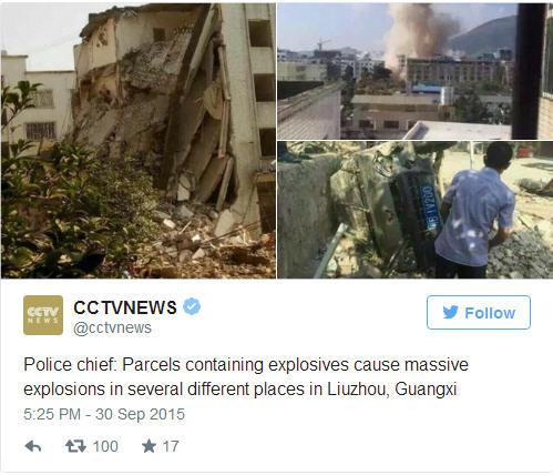ព័ត៌មានអន្តរជាតិ ៖ ហោចណាស់ មនុស្ស ៧ នាក់បាន ស្លាប់ បាត់បង់ជីវិត ខណៈរាប់សិបនាក់ ផ្សេងទៀត រងរបួស ធ្ងន់ ស្រាល ក្រោយពីមានករណី បំផ្ទុះគ្រាប់បែក ជាស៊េរី ដល់ទៅ ១៧ គ្រាប់ នៅក្នុងទីក្រុង Liuzhou តំបន់ស្វ័យយ័ត Guangxi ភាគខាងជើង ប្រទេសចិន ជាប់ព្រំប្រទល់ដែន ប្រទេសវៀតណាម ។