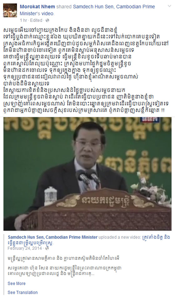 លោកស្រី ញ៉ែម មរកត បានសរសេរលើទំព័រ Facebook របស់ខ្លួន ដោយត្អូញត្អែរប្រាប់សម្តេចតេជោ ហ៊ុន សែន នាយករដ្ឋមន្រ្តី នៃកម្ពុជាថា «សម្តេចអើយចៅហ្វាយក្រុងកែប ងិន ងិនដា លួចដីនាងខ្ញុំ ទៅធ្វើប្លង់ដាក់ឈ្មោះខ្លួនឯង ឃុបឃិតគ្នាយកដីនេះទៅលក់បោកគេបន្តទៀត ក្រសួងអធិការកិច្ចអង្កេតឃើញជាប់ដូចសម្លកំពិសគេដឹងពេញខេត្តកែបហើយនៅតែមិនហ៊ានចាប់ចោរទៀត ពួកគេមិនស្តាប់អនុសាសន៍សម្តេចទេ គេថា ធ្វើមន្រ្តីល្អគ្មានលុយទេ ធ្វើមន្រ្តីខិលខូចទើបឆាប់មានបាន ពួកគេស្គាល់តែលុយប៉ុណ្ណោះ»។
