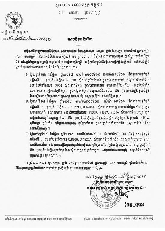 ភ្នំពេញ៖ អគ្គិសនីកម្ពុជា បានចេញសេចក្តីជូនដំណឹងមួយ ដោយបញ្ជាក់ពីការផ្អាកផ្គត់ផ្គង់ ចរន្តអគ្គិសនី តំបន់មួយ ចំនួនក្នុងរាជធានីភ្នំពេញ និងខេត្តកណ្តាល ចាប់ពីថ្ងៃទី១៣ ដល់ថ្ងៃទី១៥ ខែវិច្ឆិកា ឆ្នាំ២០១៥ ដើម្បីធ្វើការជួស ជុលផ្លាស់ប្តូរដំឡើងបរិក្ខារ និងរុះរើគន្លងខ្សែបណ្តាញ បង្កលក្ខណៈ ដល់ការដ្ឋានពង្រីកផ្លូវជាដើម ៕