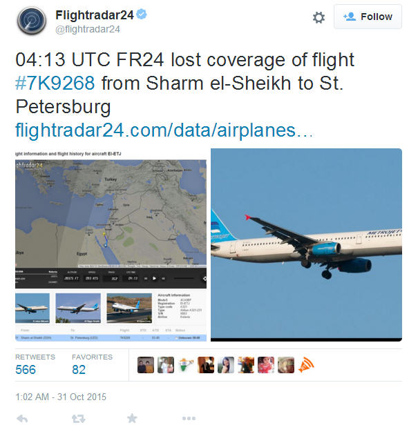 បំណែក យន្តហោះធ្លាក់ ត្រូវបានគេរកឃើញពាសពេញផ្ទៃដី ២០គ.ម ការ៉េ នៃតំបន់ ភាគ កណ្តាល ឧបទ្វីប Sinai ។ មកដល់បច្ចុប្បន្នភាព សាកសពមនុស្ស ១៦៣ នាក់ ត្រូវបានគេរកឃើញហើយ ។ របាយការណ៍ បញ្ជាក់អោយដឹងថា ៖ ក្រុមជី ហាត ដែលមានទំនាក់ទំនងស្អិតរមួតជាមួយនឹង ក្រុម រដ្ឋ អ៊ីស្លាម ជ្រុលនិយម ISIS នោះ បានធ្វើសេចក្តី ប្រកាស អះអាងនៅលើបណ្តាញសង្គម ថាខ្លួន ពិតជា បានវាយប្រហារ ទម្លាក់ យន្តហោះក្រុមហ៊ុន អាកាសចរណ៍ រុស្ស៊ី ជើងហោះហើរ KGL9268 ពិត ប្រាកដមែន ។