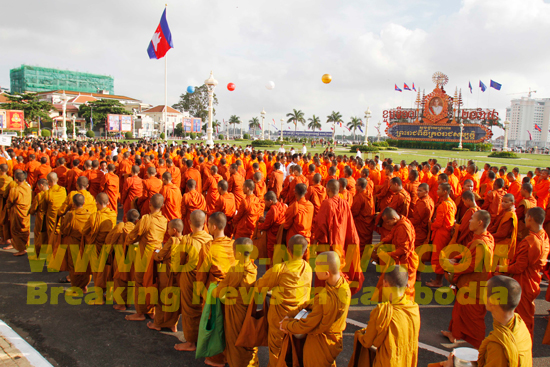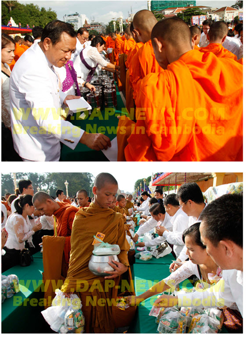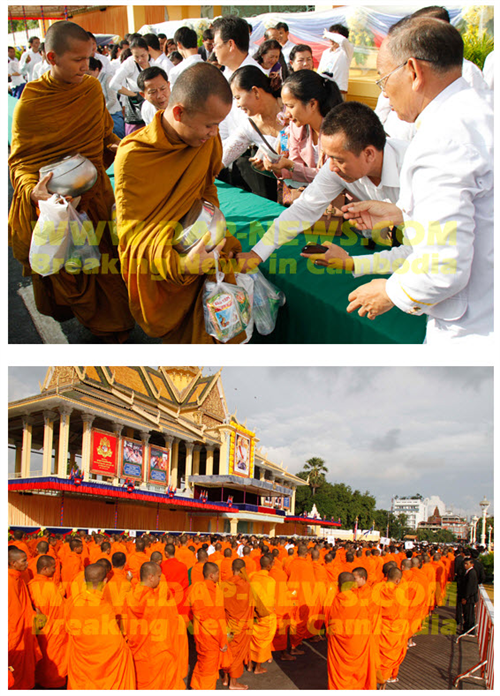ភ្នំពេញ ៖ អភិបាលរាជធានីភ្នំពេញ លោកប៉ា សុជាតិវង្ស និងថ្នាក់ដឹកនាំមន្ដ្រី សាលារាជធានីភ្នំពេញ ជាច្រើននាក់បាន អញ្ជើញចូលរួមក្នុងរាប់បាត្រ ព្រះសង្ឃ៥០០ អង្គ នៅមុខព្រះបរមរាជវាំង កាលពីព្រឹក ថ្ងៃទី២៨ ខែតុលា ឆ្នាំ២០១៤ ដើម្បី ចូលរួម អបអរសាទរព្រះរាជពិធីបុណ្យ គម្រប់ខួប ១០ឆ្នាំ នៃការឡើងគ្រងរាជ្យ របស់ព្រះមហាក្សត្រ ព្រះ ករុណា ព្រះ បាទសម្ដេចព្រះបរមនាថ នរោត្ដមសីហមុនី ដែលគ្រោងប្រារឰធ្វើឡើងនៅថ្ងៃទី២៩ ខែតុលាខាងមុខនេះ ។