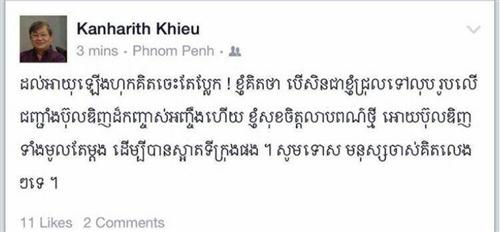 លោករដ្ឋមន្រ្តីបានសរសេរនៅលើទំព័រ Facebook នៅថ្ងៃទី១៨ ខែធ្នូនេះថា «ដល់អាយុឡើងហុកគិតចេះតែប្លែក ! ខ្ញុំគិតថា បើសិនជាខ្ញុំជ្រុលទៅលុបរូបលើជញ្ជាំងប៊ុលឌិញដ៏កញ្ចាស់អញ្ចឹងហើយ ខ្ញុំសុខចិត្តលាបពណ៌ថ្មី អោយប៊ុលឌិញទាំងមូលតែម្តង ដើម្បីបានស្អាតទីក្រុងផង។ សូមទោស មនុស្សចាស់គិតលេងៗទេ»។