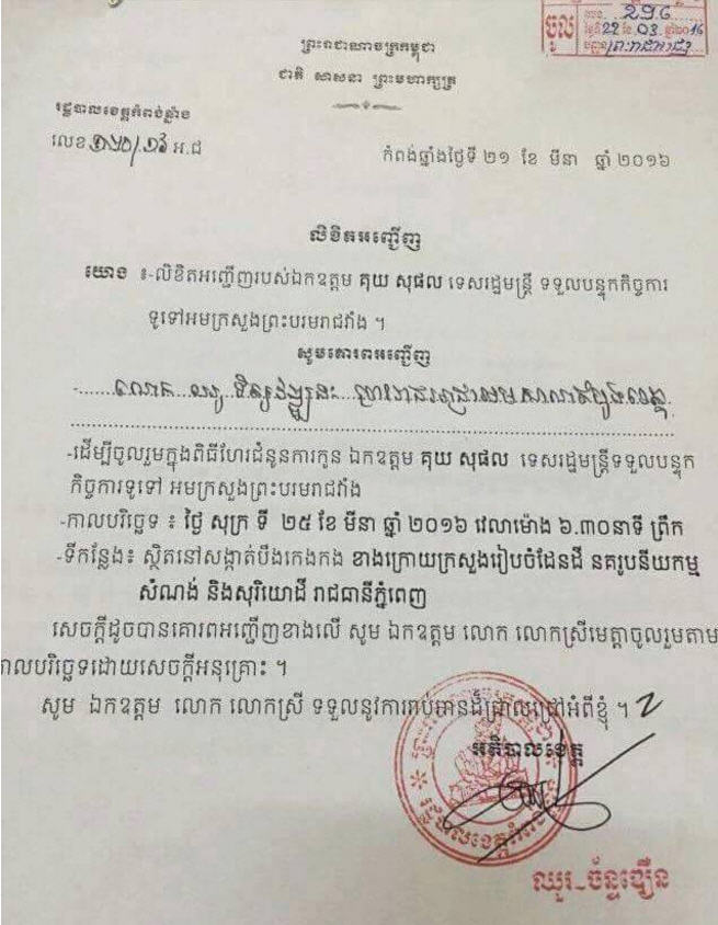 (ភ្នំពេញ)៖ នៅព្រឹកថ្ងៃទី២៣ ខែមីនា ឆ្នាំ២០១៦នេះ នៅលើបណ្ដាញទំនាក់ទំនងសង្គមហ្វេសប៊ុក មានប្រិយមិត្តជាច្រើនសំដែងនូវការ ចាប់អារម្មណ៏និងភ្ញាក់ផ្អើលដោយសារតែមានម្ចាស់ Account ខ្លះបានបង្ហោះលិខិតមួយសន្លឹក របស់សាលាខេត្តកំពង់ឆ្នាំង គឺលិខិតរបស់លោក ឈួរ ច័ន្ទឌឿន អភិបាលខេត្ត ជំរាបជូនទៅព្រះរាជអាជ្ញាអមសាលាដំបូងខេត្ត ស្ដីពីការអញ្ជើញចូលរួមហែរជំនូនកូនមន្ត្រីជាន់ខ្ពស់មួយរូប។