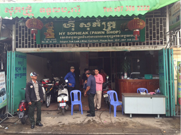 ភ្នំពេញ : ក្រោយចាប់ខ្លួន និងធ្វើការសួរនាំ ទៅជនសង្ស័យ២នាក់រួចមក ក្នុងករណីឆបោកម៉ូតូ និងចែកចាយ គ្រឿងញៀន នៅស្រុកពញាឮ ខេត្តកណ្តាល នោះ កម្លាំងអាវុធហត្ថខេត្តកណ្តាល ដឹកនាំដោយព្រះរាជអាជ្ញារង ឯក ស៊ុនរស្មី នៅព្រឹកថ្ងៃទី២០ ខែតុលា ឆ្នាំ២០១៥នេះ បានចុះមកឆែកឆេរនៅហាង បញ្ចាំមួយមានយីហោ ហ៊ី សុភក្រ្ត័ ស្ថិតនៅផ្ទះលេខ2E ផ្លូវ247 សង្កាត់ទឹកល្អក់៣ ខណ្ឌទួលគោក ពោលនៅម្តុំផ្សារឃ្លាំងរំសេវ ដែលទទួល ម៉ូតូរបស់ចោរមកបញ្ចាំ ហើយជាលទ្ធផល សមត្ថកិច្ចបានឃាត់ខ្លួន ជនសង្ស័យម្នាក់ និងដកហូតម៉ូតូមួយ គ្រឿងរបស់ជនរងគ្រោះ។