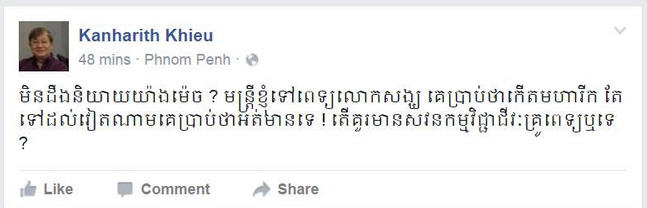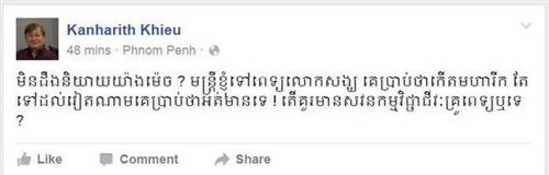 លោក ខៀវ កាញារីទ្ធ បានបញ្ជាក់នៅលើ Facebook របស់លោកនៅរសៀលថ្ងៃទី២៣ ខែកុម្ភៈ ឆ្នាំ២០១៦នេះថា «មិនដឹងនិយាយយ៉ាងម៉េច? មន្រ្តីខ្ញុំទៅពេទ្យលោកសង្ឃ គេប្រាប់ថា កើតមហារីក តែទៅដល់វៀតណាម គេប្រាប់ថាអត់មានទេ!»។