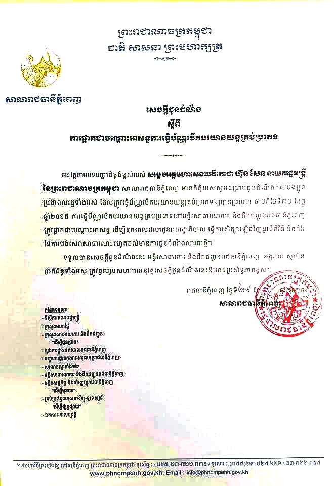 ខាងក្រោមនេះ ជាសេចក្តីប្រកាសរបស់សាលារាជធានីភ្នំពេញ៖