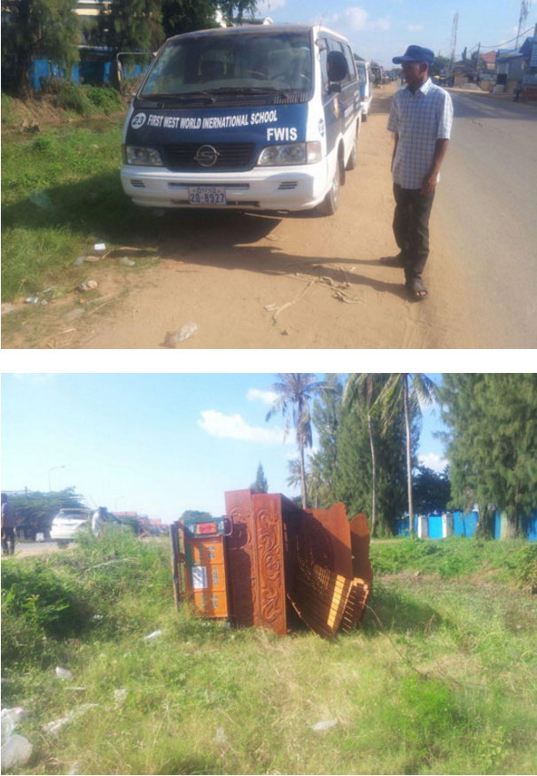 រថយន្តបង្កម៉ាកលុច្សស៊ីស RX300 ពណ៍ស ពាក់ស្លាកលេខភ្នំពេញ 2S-1573 បើកបរដោយស្ត្រីម្នាក់ និងអ្នករួបដំណើរ ប្រុស២នាក់ មិនត្រូវបានគេស្គាល់ឈ្មោះ នោះឡើយអ្នកទាំង៣នាក់ មិនត្រូវរងរបួសទេ។ រីឯម្ចាស់រ៉ឺម៉ក ប្តីមានឈ្មោះ វ៉ែន ឡន អាយុ៣៦ឆ្នាំ ប្រពន្ធមានឈ្មោះ ម៉ឹក សាម៉េន អាយុ៣៥ឆ្នាំ អ្នកទាំងពីរមានមុខរបរលក់គ្រែ សាឡុងទៅតាមខេត្ត មានទីលំនៅ ភូមិសារ៉ាម ឃុំសារ៉ាម ស្រុកឧដ្តុង ខេត្តកំពង់ស្ពឺ ហើយគ្រែនៅ លើរឺម៉កក្រឡាប់នោះ មានចំនួន៤ រងខូចខាតបន្តិចបន្តួច។