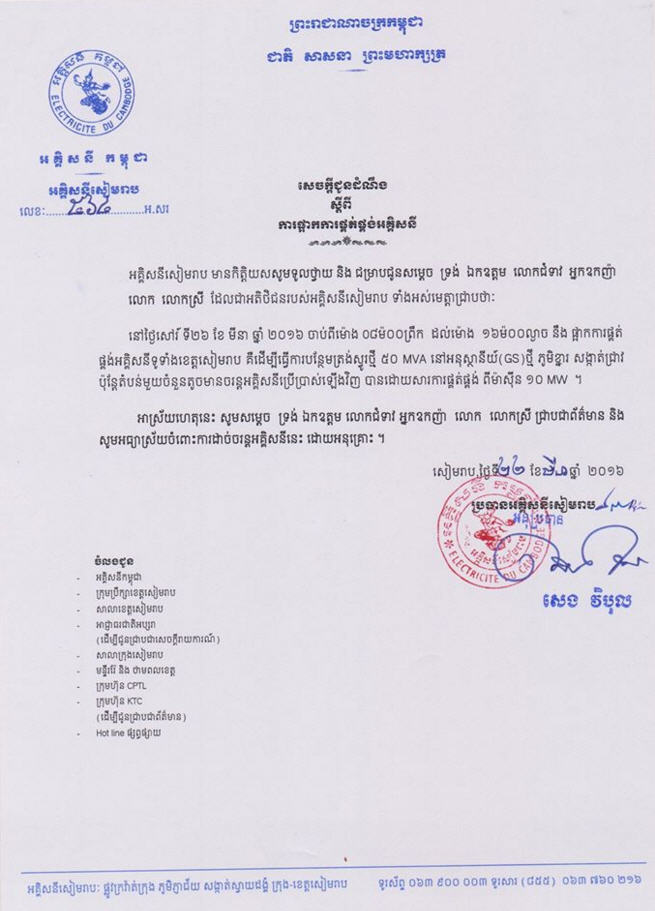 (សៀមរាប)៖ អគ្គិសនីសៀមរាប បានចេញសេចក្តីជូនដំណឹងមួយ ដោយបញ្ជាក់ពីការផ្អាកផ្គត់ផ្គង់ចរន្តអគ្គិសនីទូទាំងខេត្តសៀមរាប ទាំងមូលចាប់ពីម៉ោង ៨៖០០នាទីព្រឹក ដល់ម៉ោង ១៦៖០០នាទីរសៀលថ្ងៃសៅរ៍ ទី២៦ ខែមីនា ឆ្នាំ២០១៦ ដើម្បីធ្វើការបន្ថែមត្រង់ស្វូរថ្មី ៥០ MVA នៅអនុស្ថានីយ៍ (GS) ថ្មី ក្នុងភូមិខ្នារ សង្កាត់ជ្រាវ ក្រុងសៀមរាប៕