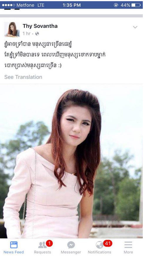 (ភ្នំពេញ)៖ យុវតីដែលធ្លាប់បានធ្វើចលនាដ៏ផុសផុលស្វែងរកសំឡេងឆ្នោតឲ្យគណបក្សសង្រ្គោះជាតិកាលពីឆ្នាំ២០១៣ កញ្ញា ធី សុ វណ្ណថា បានចេញមកបង្ហាញសារខ្លីមួយលើទំព័រ Facebook របស់ខ្លួន ដោយបានលើកថា កញ្ញាអាចទ្រាំបានការជេរពីមនុស្សជា ច្រើននាក់ តែកញ្ញា មិនអាចទ្រាំបានឡើយ នៅពេលឃើញមនុស្សម្នាក់ បោកប្រាស់មនុស្សជាច្រើននាក់។