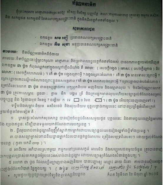 ភ្នំពេញ៖ ប្រជាពលរដ្ឋខេត្តកំពត ទាំង ព្រះសង្ឃ សិស្ស និស្សិត និងបញ្ញវន្ត គណៈកម្មការអាចារ្យ គ្រូពេទ្យ កម្មករ កសិករ សកម្មជន គណបក្សសង្រ្គោះជាតិ បានបាចខិតប័ណ្ណ ជាច្រើនសន្លឹក ទាមទារបណ្តេញលោក ជា ប៉ូច តំណាងរាស្រ្តគណបក្សសង្រ្គោះជាតិ ចេញពីដំណែងជាលើកទី២។