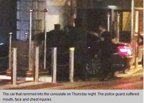 សេចក្តីថ្លែងការណ៍រួមបញ្ជាក់អោយដឹង ព្រឹកថ្ងៃសុក្រនេះ មានសំណាក គម្រូ យោងមន្រ្តីប៉ូលីសក្រុង សៀងហៃនោះអោយដឹងថា ៖ រថយន្ត តូយូតា ពណ៌ ខ្មៅមួយគ្រឿង ស្លាក លេខ ផ្លូវការពីខេត្ត Fujian ភាគខាងត្បូង ឆៀងខាងកើត ប្រទេសចិន នោះ បានបើក តាមបណ្តោយផ្លូវ South Urumqi Road មាន វិនាទីមួយនេះ បានងាករេទៅខាងស្តាំ និងបន្តបុកទាំងកម្រោល តែម្តង ទៅនឹងស្ថានកុងស៊ុល សហរដ្ឋ អាមេរិក ចំពីមុខច្រកចេញចូល នាវេលាម៉ោង ៩ និង ៤៣ នាទីយប់ ។ ភ្លាមៗ មន្រ្តីប៉ូលីសប្រចាំការក្បែរ ទីនោះ ក៏ដូចជា ឆ្មាំ ស្ថានកុងស៊ុល បានធ្វើការចាប់ឃាត់ខ្លួន អ្នកបើកបរ ។