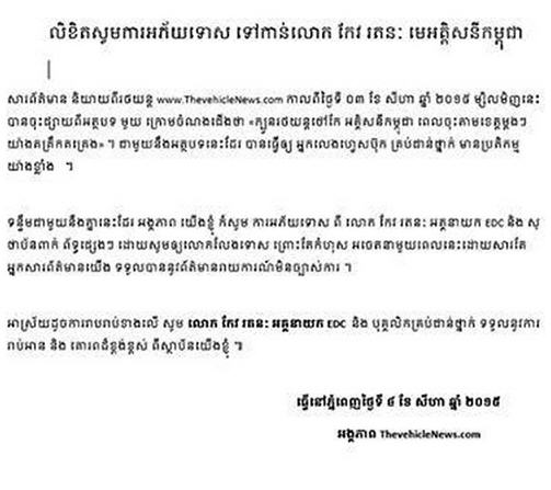 ភ្នំពេញ៖ គេហទំព័រ ThevehicleNews បានស្នើសុំលោក កែវ រតនៈ អគ្គនាយកអគ្គិសនីកម្ពុជា លើកលែងទោស ឲ្យខ្លួន ចំពោះកំហុសឆ្គងលើការចេញផ្សាយ។ គេហទំព័រ បានបញ្ជាក់ថា កំហុសឆ្គងនេះ ដោយសារអ្នកព័ត៌មាន របស់ខ្លួន ទទួលបានសេចក្តីរាយការណ៍មិនច្បាស់ការ។