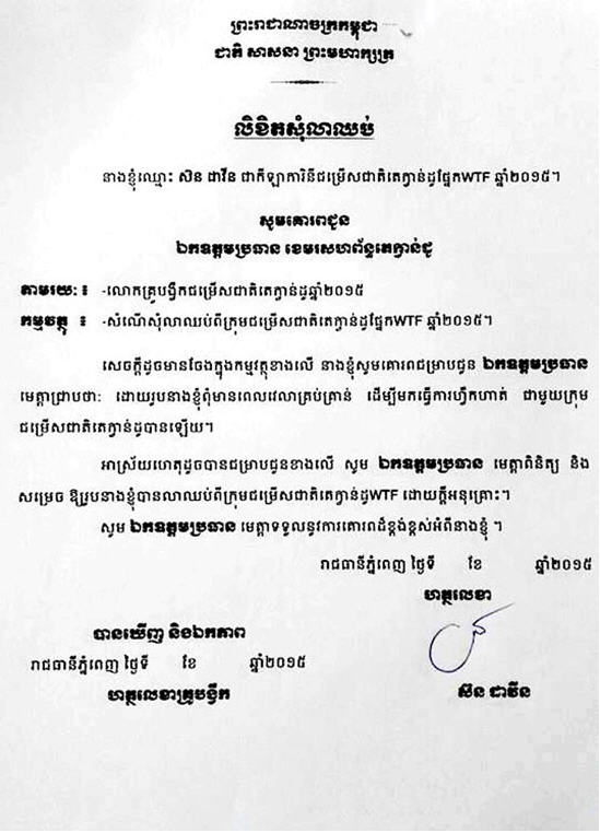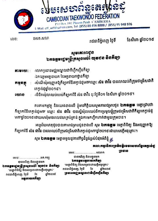 ក្រោយទទួលបានលិខិតដ៏គួរឲ្យសោកស្ដាយមួយនេះ ថ្នាក់ដឹកនាំខេមរៈសហព័ន្ធតេក្វាន់ដូ បានសរសេរលិខិតមួយជូន ដំណឹងទៅក្រសួងអប់រំ យុវជន និងកីឡា ដើម្បីរាយការណ៍អំពីការដាក់ពាក្យលាឈប់របស់កីឡាការិនី ស៊ន ដាវីន ប៉ុន្ដែ ខណៈពេលនេះ នៅមិនទាន់មានការសម្រេច អនុញ្ញាតឲ្យភរិយារបស់កីឡាករប្រដាល់ វ៉ន វីវ៉ា នេះឈប់ឬក៏យ៉ាងណា នោះទេ ។