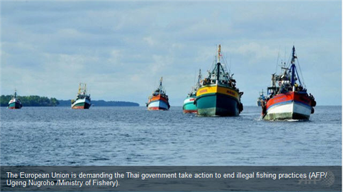 ប្រទេសថៃ កំពុងតែប្រឈមមុខជាមួយនឹងការបោសសម្អាត ឧស្សាហកម្ នេសាទខុសច្បាប់ បន្ទាប់ សហភាពអឺរ៉ុប ប្រមានថានឹងហាមមិនអោយមានការ នាំចូល នូវគ្រឿងសមុទ្រពីប្រទេសថៃ នោះទេ បើសិនណា បើពុំមានចាត់វិធានការ ផ្លូវការ និងច្បាស់លាស់ណាមួយ ក្នុងអំឡុងពេល ៦ ខែ ។ មន្រ្តី ផ្លូវការប្រទេសថៃ បំភ្លឺអោយដឹង ថា រដ្ឋាភិបាល របស់ខ្លួន បានចាត់វិធានការ លុបបំបាត់ចោល ការ នេសាទខុសច្បាប់ ចាប់តាំងពីខែ តុលា ឆ្នាំមុនមកម្ល៉េះ ជា លទ្ធផល ចំណាត់ការសម្រេចបានពាក់ កណ្តាលហើយ ។