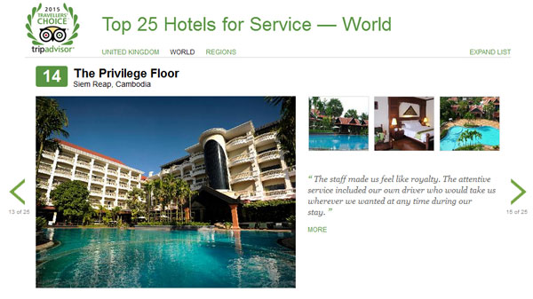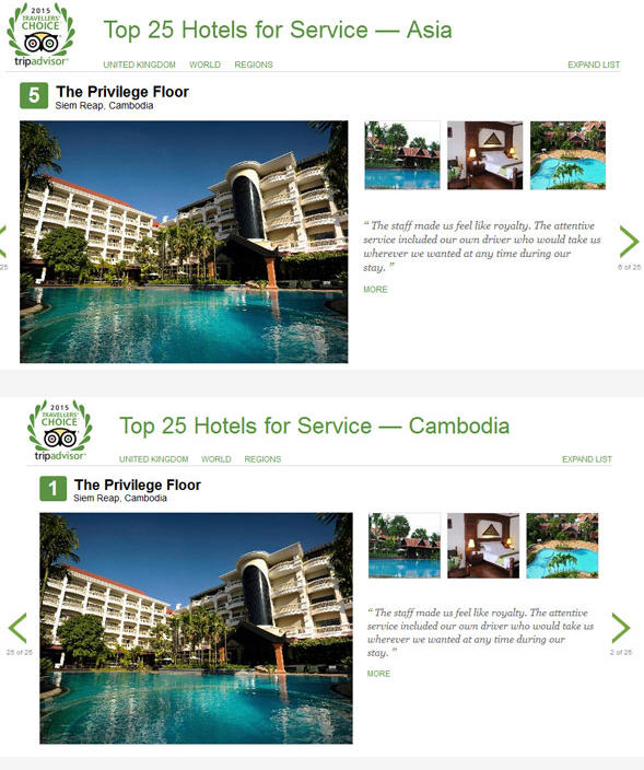 នៅក្នុងនោះយើងសង្កេតឃើញមាន សណ្ឋាគាររបស់ខ្មែរដែលមានឈ្មោះថា The Privilege Floor ដែលស្ថិតក្នុងខេត្តសៀមរាប បានទទួលរង្វាន់ខាងផ្នែក សេវាកម្មល្អបំផុត ជាប់ចំណាត់ថ្នាក់លេខ១ ក្នុងប្រទេសកម្ពុជា ចំណាត់ថ្នាក់លេខ៥ ក្នុងតំបន់អាស៊ី និង ចំណាត់ថ្នាក់ទី១៤ លំដាប់ពិភពលោក ក្នុងចំណោមសណ្ឋាគារ កំពូលៗទាំង២៥។