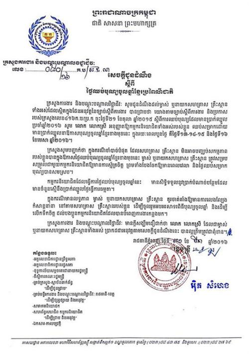 សេចក្តីជូនដំណឹងរបស់ក្រសួងអប់រំ បញ្ជាក់ទៀតថា «ក្នុងករណីចាំបាច់បំផុត ដែលសហគ្រាស គ្រឹះស្ថាន មិនអាចបញ្ឈប់សកម្មភាពរបស់ខ្លួន បានក្នុងឱកាសថ្ងៃឈប់បុណ្យចូលឆ្នាំខ្មែរខាងមុខនេះ ម្ចាស់ ឬនាយកសហគ្រាស គ្រឹះស្ថាន ត្រូវសម្របសម្រួលជាមួយកម្មករ និយោជិតឲ្យមានការស្ម័គ្រចិត្ត ព្រមទាំងបែងចែកឲ្យមានពេលវេលា និងថ្ងៃឈប់សម្រាក បុណ្យបានសមស្រប។ កម្មករនិយោជិត ដែលធ្វើការថ្ងៃឈប់បុណ្យចូលឆ្នាំនេះ មានសិទ្ធិទទួលនូវប្រាក់បំណាច់បន្ថែមដែលមានចំនួន ស្មើនឹងប្រាក់ឈ្នួលថ្ងៃធ្វើការធម្មតា»៕