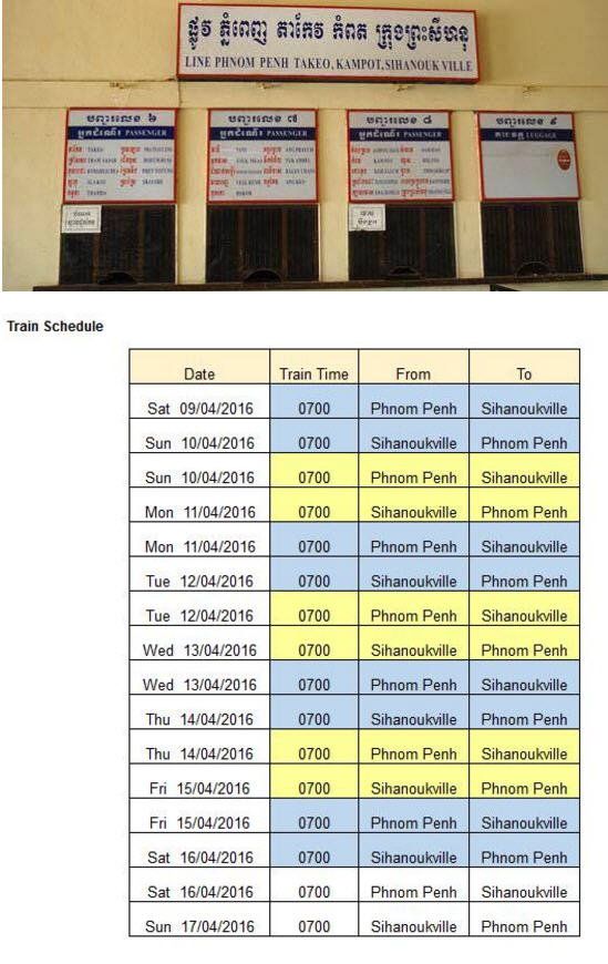 (ភ្នំពេញ)៖ រថភ្លើងដឹកអ្នកដំណើរ ពីភ្នំពេញ ទៅព្រះសីហនុ ឬពីព្រះសីហនុមកភ្នំពេញ នឹងត្រូវដំណើរការឡើងវិញ នៅថ្ងៃទី៩ ខែមេសា ឆ្នាំ២០១៦ខាងមុខនេះ ពោលគឺនៅមុនថ្ងៃមកដល់ នៃពិធីបុណ្យចូលឆ្នាំប្រពៃណីខ្មែរ ដែលបងប្អូនប្រជាពលរដ្ឋ សម្រុកចេញពីភ្នំពេញ ទៅតាមបណ្តាលខេត្ត ហើយការដំណើរការខ្សែរថភ្លើងនេះ រំពឹងថានឹងជួយសម្រួលដល់ចរាចរណ៍បានមួយកំរិត។
