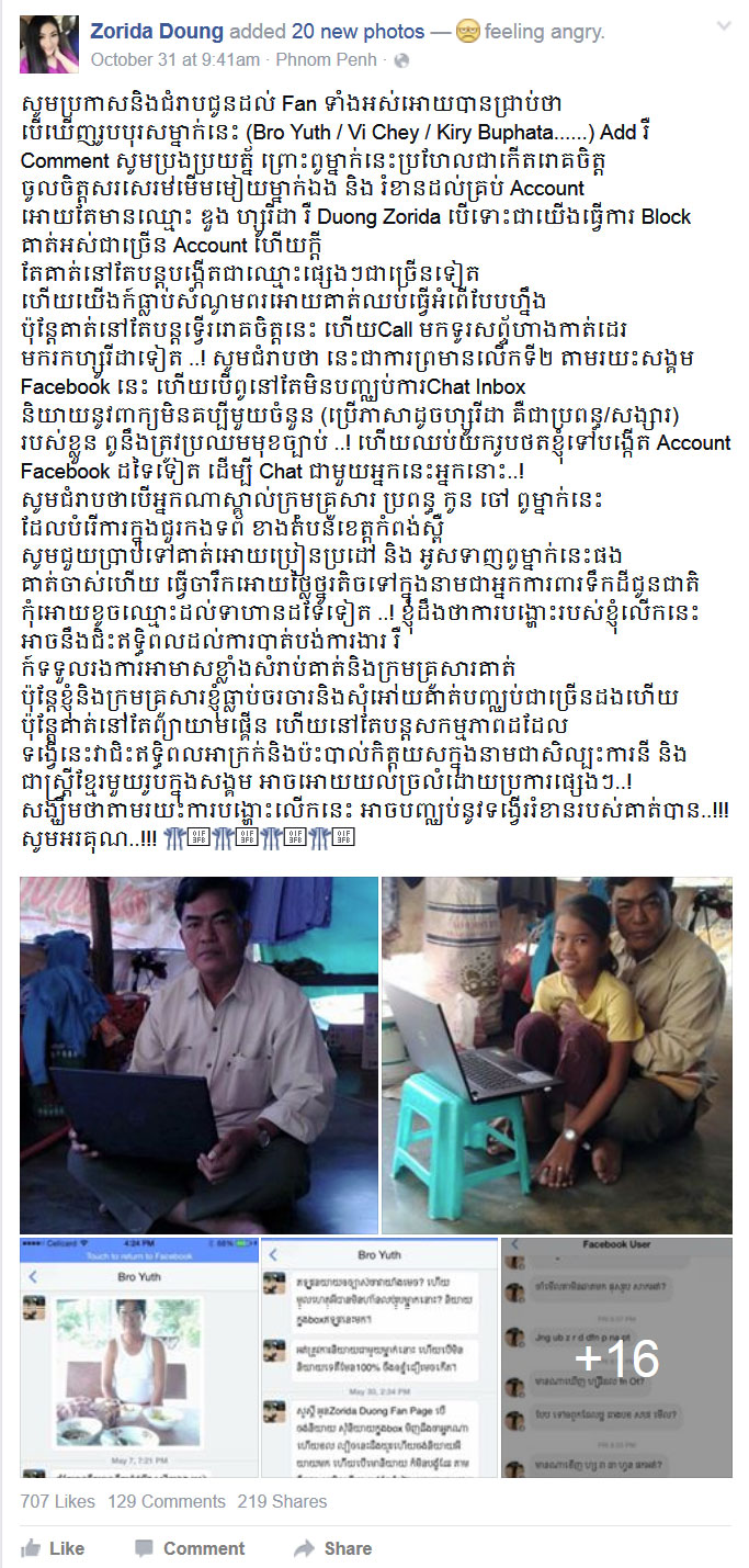 នៅក្នុងសារខាងលើនេះ បានសរសេររៀបរាប់ នឹងព្រមានចាត់វិធានការ ទៅលើបុរសរូបនោះទៀតថា «កន្លងមកយើងក៏ធ្លាប់សំណូមពរ អោយគាត់ឈប់ធ្វើអំពើបែបហ្នឹង ប៉ុន្តែគាត់នៅតែបន្តទង្វើរោគចិត្តនេះ ហើយCall មកទូរសព្ទ័ហាងកាត់ដេរ មករកហ្សូរីដាទៀត ..! សូមជំរាបថា នេះជាការព្រមានលើកទី២ តាមរយៈសង្គម Facebook នេះ ហើយបើពូនៅតែមិនបញ្ឈប់ ការChat Inbox និយាយនូវពាក្យមិនគប្បីមួយចំនួន (ប្រើភាសាដូចហ្សូរីដា គឺជាប្រពន្ធ/សង្សារ) របស់ខ្លួន ពូនឹងត្រូវប្រឈមមុខច្បាប់ ..! ហើយឈប់យករូបថតខ្ញុំ ទៅបង្កើត Account Facebook ដទៃទៀត ដើម្បីChat ជាមួយអ្នកនេះអ្នកនោះ..!»។