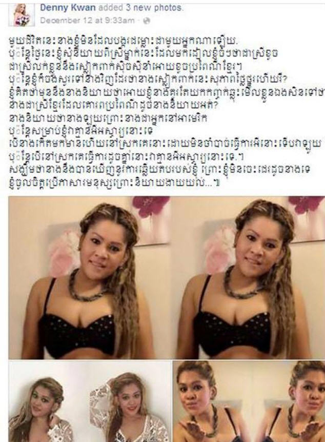 គ្រាន់តែមានរលករិះគន់យ៉ាងធ្ងន់ ស្ទើរតែមិនអាចទទួលយកបាននេះភ្លាម ស្រីស្រស់សម្បូរសាច់ដើមទ្រូងទ្រលុកទ្រលន់គន់មិនចេះជិនណាយ កញ្ញា ដេននី បានប្រតិកម្មភ្លាមវិញ តបតាមរយៈសារក្នុងបណ្ដាញដ៏ពេញនិយមនេះថា«មួយជីវិតនេះនាងខ្ញុំ មិនដែលបង្ករជម្លោះ ជាមួយអ្នកណាឡើយ. ប៉ុន្តែថ្ងៃនេះខ្ញុំ សុំនិយាយពីស្រីម្នាក់នេះ ដែលមកដៀលខ្ញុំចំៗថាជាស្រីខូច ជាស្រីលក់ខ្លួន នឹងស្លៀកពាក់សិចស៊ី នាំឲ្យខូចប្រពៃណីខ្មែរ។ ខ្ញុំក៏ចង់សួរទៅនាងវិញដែរថា នាងស្លៀកពាក់នេះ សុភាពថ្លៃថ្នូរហើយឬ? ខ្ញុំគិតថាមុននឹងនាងនិយាយថា ឲ្យខ្ញុំនាងគួរតែយកកញ្ចក់ឆ្លុះមើលខ្លួនឯងសិនទៅថា នាងជាស្រីខ្មែរដែលគោរពប្រពៃណី ដូចនាងនិយាយអត់? នាងនិយាយថានាងឡូយ ព្រោះនាងជាអ្នកនៅអាមេរិក ប៉ុន្តែសម្រាប់ខ្ញុំវាគ្មានអីអស្ចារ្យនោះទេ បើនាងកើតមកមានហើយ នៅស្រុកគេនោះ ដោយមិនចាំបាច់ធ្វើការអីនោះ ទើបវាឡូយ ប៉ុន្តែបើនៅស្រុកគេធ្វើការដូចគ្នានោះ វាគ្មានអីអស្ចារ្យនោះទេ.។ សង្ឃឹមថានាងនឹងបានឃើញ នូវការឆ្លើយតបរបស់ខ្ញុំ ព្រោះខ្ញុំមិនចេះជេរដូចនាងទេ ខ្ញុំចូលចិត្តប្រើភាសាមនុស្សព្រោះនិយាយងាយយល់» ។