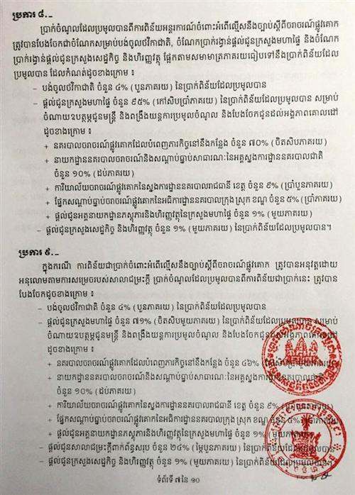 ប្រកាសអន្តរក្រសួងបញ្ជាក់ថា ប្រាក់ចំណូលដែលប្រមូលបាន ពីការពិន័យអន្តរការណ៍ ចំពោះអំពើល្មើស នឹងច្បាប់ស្តីពីចរាចរណ៍ផ្លូវគោក ត្រូវបានបែងចែកជាចំណែក សម្រាប់បង់ចូលថវិកាជាតិ, ចំណែកប្រាក់រង្វាន់ផ្តល់ជូន ក្រសួងមហាផ្ទៃ និងចំណែកប្រាក់រង្វាន់ផ្តល់ជូន ក្រសួងសេដ្ឋកិច្ច និងហិរញ្ញវត្ថុ ផ្អែកតាមសមាមាត្រភាគរយធៀប ទៅនឹងប្រាក់ពិន័យដែលប្រមូលបាន ដែលកំណត់ដូចខាងក្រោម៖