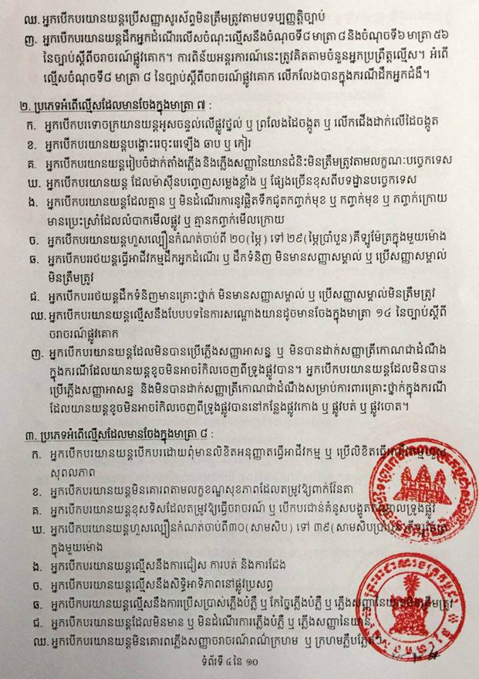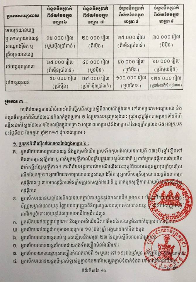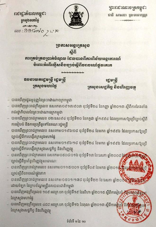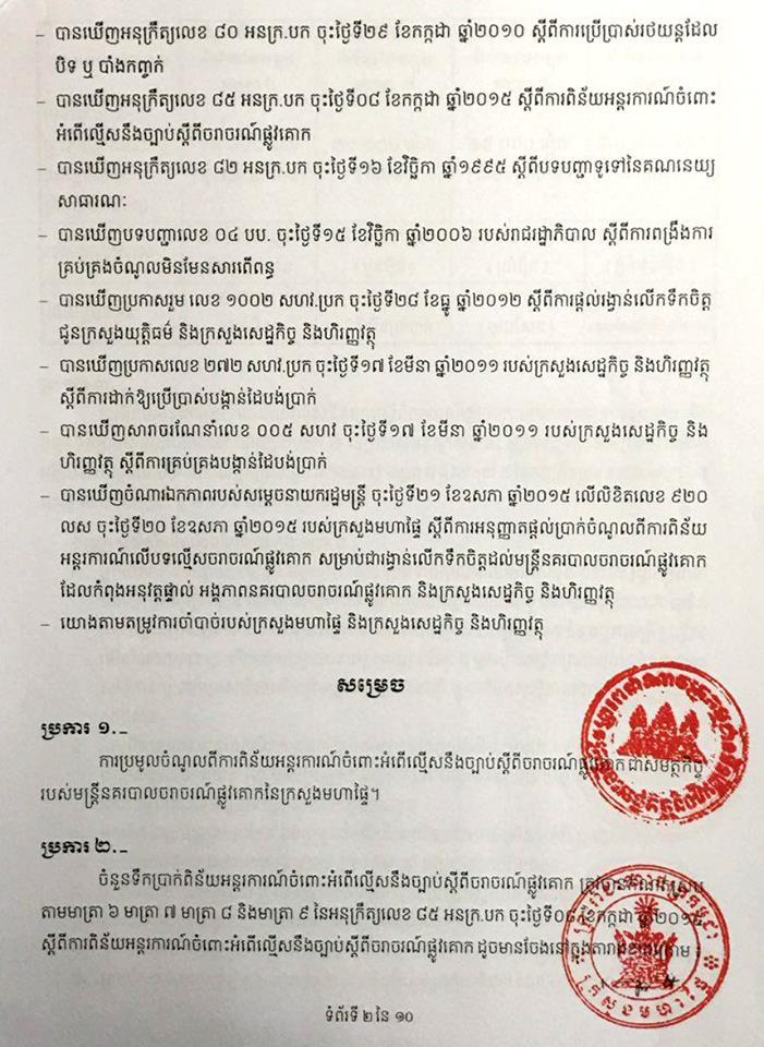 (ភ្នំពេញ)៖ ក្រសួងមហាផ្ទៃ និងក្រសួងសេដ្ឋកិច្ច និងហិរញ្ញវត្ថុ បានចេញប្រកាសអន្តរក្រសួង ស្តីពីការគ្រប់គ្រងប្រាក់ចំណូល ដែលបានពីការពិន័យអន្តរការណ៍ ចំពោះអំពើល្មើសនឹងច្បាប់ស្តីពីចរាចរណ៍ផ្លូវគោក ដោយកំណត់ឲ្យមន្ត្រីនគរបាលចរាចរណ៍ ផ្លូវគោកនៃក្រសួងមហាផ្ទៃ ជាអ្នកប្រមូលចំណូលពីការផាកពិន័យ ចំពោះអំពើល្មើសនឹងច្បាប់ចរាចរណ៍។