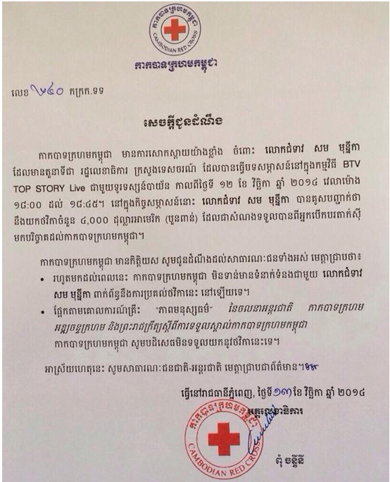 យោងតាម សេចក្ដីជូន ដំណឹងរបស់ កាកបាទក្រហមកម្ពុជា នៅថ្ងៃទី១៣ ខែវិច្ឆិកា ឆ្នាំ២០១៤នេះ បានបញ្ជាក់ថា «កាក បាទក្រហមកម្ពុជា មានការសោកស្ដាយ យ៉ាងខ្លាំង ចំពោះលោកជំទាវ សម មុន្នីកា ដែលមានតួនាទី ជារដ្ឋ លេខាធិការ ក្រសួងទេសចរណ៍ បានធ្វើបទសម្ភាសន៍នៅ ក្នុងកម្មវិធី BTV TOP STORY Live ជាមួយ ទូរទស្សន៍បាយ័ន កាលពី ថ្ងៃទី១២ ខែវិច្ឆិកា ឆ្នាំ២០១៤ វេលាម៉ោង១៨ដល់ម៉ោង១៨និង៤៥នាទី ។ នៅក្នុងកិច្ចសម្ភាសន៍នោះលោកជំទាវ សម មុន្នីកា បានគូសបញ្ជាក់ថា និងយកថវិកា ចំនួន៤០០០ដុល្លារ ដែលជាសំណងទទួលបាន ពីអ្នកបើកបរ តាក់ស៊ីមក បរិច្ចាគដល់កាកបាទក្រហមកម្ពុជា»។