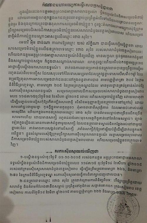 ដោយសារតែពន្លឺយុត្តិធម៌នៅសាលាដំបូងខេត្តសៀមរាមមិនបានលេចអណ្តែត ធ្វើឲ្យស្រ្តីមេម៉ាយរូបនេះ ខិតខំបន្តស្វែងរកអន្តរាគមន៏ មកតុលាការថ្នាក់ទី២ គឺសាលាឧទ្ធរណ៏ ។ ក្រោយក្តាប់សេចក្តី នៃដំណើររឿងរួចហើយ អគ្គព្រះរាជអាជ្ញា គឺលោក អ៊ុក សាវុធ បានធ្វើពាក្យបណ្តឹងជំទាស់ ការសម្រេចរបស់សាលាដំបូងខេត្ត ។
