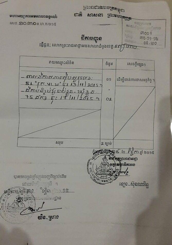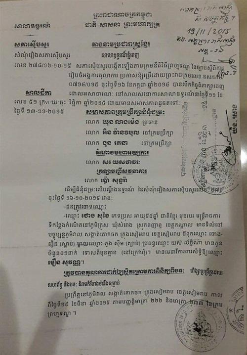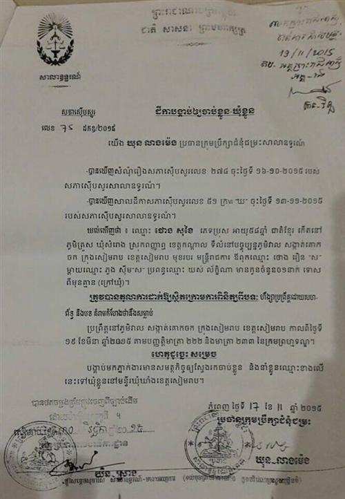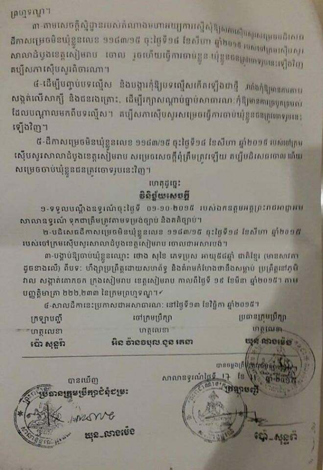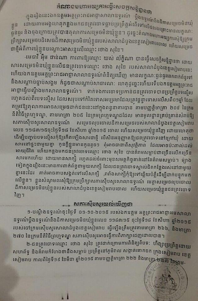 ជាមួយគ្នានេះ តុលាការខេត្តសៀមរាប មិនបានបញ្ជូនដីកាបញ្ជាឲ្យចាប់ខ្លួន និងឃុំខ្លួន ដែលចេញដោយសាលាឧទ្ធរណ៏ ទៅមន្រ្តីនគរបាលយុត្តិធម៏នោះឡើយ រហូតមកដល់ថ្ងៃទី១៤ ខែធ្នូ ឆ្នាំ២០១៥នេះ ហេតុដូច្នេះហើយ កម្លាំងនគរបាល និងកម្លាំងអាវុធហត្ថខេត្ត មិនអាចអនុវត្ត និងហានទៅចាប់ខ្លួនជនត្រូវចោទបានទេ។