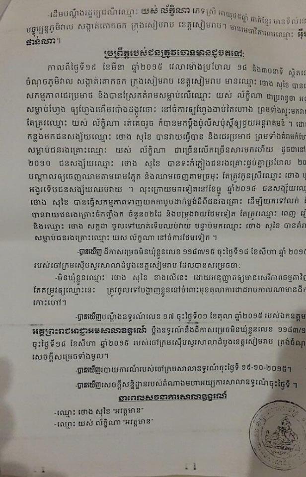 អ្នកស្រី យស់ លក្ខ័ណា បានរៀបរាប់ថា ក្រោយពីប្រើអំពើហិង្សា និងគំរាមសម្លាប់យ៉ាងដូច្នេះ ធ្វើឲ្យអ្នកស្រីមានការភ័យខ្លាចយ៉ាងខ្លាំង ទើបបានទៅដាក់ពាក្យបណ្តឹង នៅសាលាដំបូងខេត្តសៀមរាប ដើម្បីឲ្យជួយអន្តរាគមន៏ ប៉ុន្តែពន្លឺយុត្តិធម៏ មិនបានអណ្តែតឡើងនោះឡើយ ពោលជនបង្កមិនត្រូវបានព្រះរាជអាជ្ញាខេត្ត ធ្វើការចោទប្រកាន់ និងឃុំខ្លួននោះទេ ទុកឲ្យមានសេរីភាពដដែល ហើយជននេះបានបន្តសកម្មភាព គំរាមកំហែងរហូត។