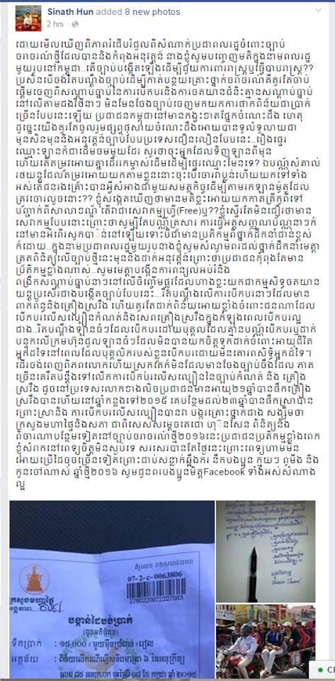 លោកស្រីសរសេរថា «សង្ឃឹមថា ក្រសួងមហាផ្ទៃ និងសភា ជាពិសេសសម្តេចតេជោ ហ៊ុន សែន ពិនិត្យនិងពិចារណាបន្ថែមទៀត នៅច្បាប់ចរាចរណ៍ថ្មី២០១៦នេះ ប្រជាជនប្រតិកម្មខ្លាំងពេក»។