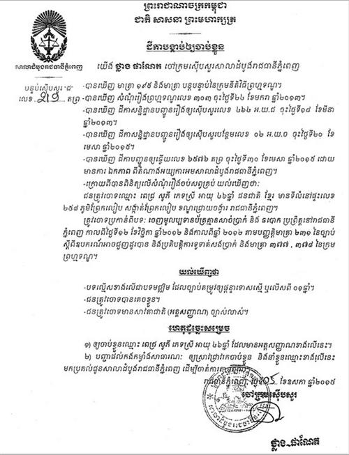 ភ្នំពេញ៖ លោក ថ្លាង ផាណែត ចៅក្រមស៊ើបសួរសាលា ដំបូងរាជធានីភ្នំពេញ បានចេញដីកាបង្គាប់ឲ្យតាមចាប់ ខ្លួនអ្នកស្រី ពេជ្រ សូភី ភរិយាចៅសង្កាត់ព្រែកលៀប ពីបទឆបោកប្រាក់ប្រមាណ ៨២ម៉ឺនដុល្លារអាម៉េរិក។