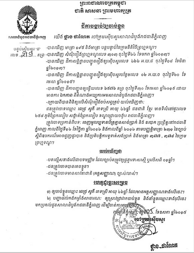 សូមបញ្ជាក់ថា អ្នកស្រី ពេជ្រ សូភី អាយុ ៤៦ឆ្នាំ មានទីលំនៅផ្ទះលេខ២៥៨ ភូមិព្រែកលៀប សង្កាត់ព្រែកលៀប ខណ្ឌជ្រោយចង្វារ រាជធានីភ្នំពេញ ត្រូវបានតុលាការចោទប្រកាន់ពី «ចេញមូលប្បទានប័ត្រគ្មានសាច់ប្រាក់ និង ឆបោក» ដែលបានប្រព្រឹត្តឡើងកាលពីថ្ងៃទី១២ ខែវិច្ឆិកា ឆ្នាំ២០១២ តាមមាត្រា ២៣១ នៃច្បាប់ស្តីពីឧបករណ៍ អាចជួយដូរបាន និងប្រតិបត្តិការទូទាត់សងប្រាក់ និងមាត្រា ៣៧៧, ៣៧៨ នៃក្រមព្រហ្មទណ្ឌ៕