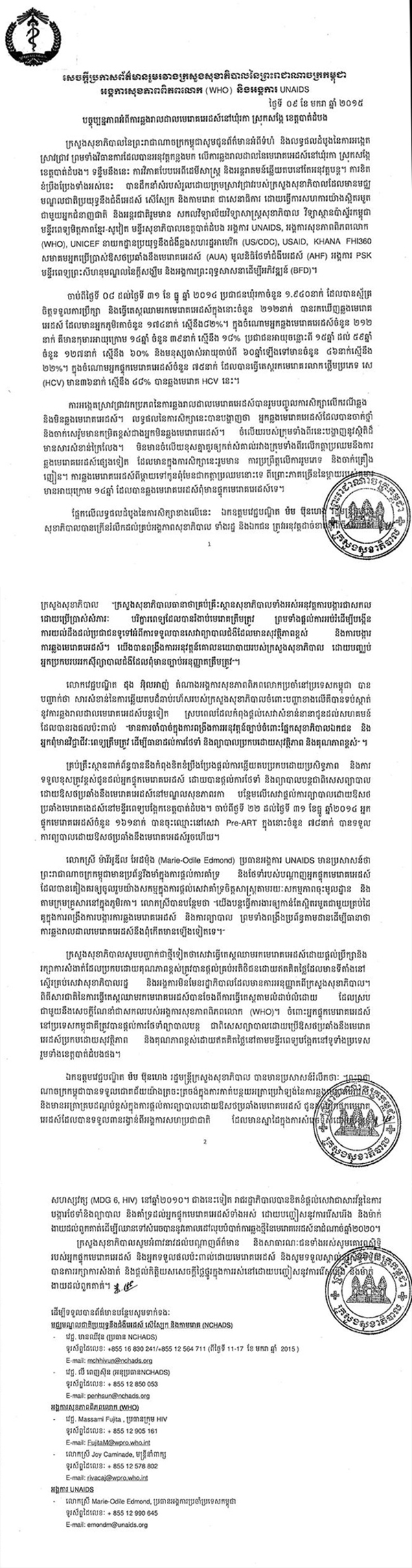 យោងតាមសចក្តីប្រកាសព័ត៌មានរួម របស់ក្រសួងសុខាភិបាល និង WHO នៅថ្ងៃទី៩ ខែមករា ឆ្នាំ២០១៥ បានឲ្យដឹងថា «ការអង្កេតស្រាវជ្រាវ រកប្រភព នៃការឆ្លងរាលដាល មេរោគអេដស៍ បានរួមបញ្ចូលការ សិក្សាករណីឆ្លង និងមិនឆ្លង មេរោគអេដស៍ ។ លទ្ធផលនៃការសិក្សានេះ បានបង្ហាញថា អ្នកឆ្លងមេរោគអេសដ៍ ដែលបានចាក់ថ្នាំ និងចាក់សេរ៉ូម មានកម្រិតខ្ពស់ជាង អ្នកមិនឆ្លងមេរោគអេដស៍» ។