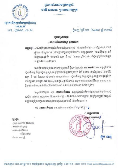 (ភ្នំពេញ)៖ រដ្ឋាករទឹកស្វយ័តក្រុងភ្នំពេញ នឹងផ្អាកផ្គត់ផ្គង់ទឹក ជូនប្រជាពលរដ្ឋដែលមានលំនៅ ដ្ឋាននៅលើផ្លូវ៧០ ដល់ផ្លូវ២៨៧ ដែលស្ថិតក្នុងសង្កាត់បឹងកក់១ ខណ្ឌទួលគោក រយៈពេលជាង៤ម៉ោង នៅយប់ថ្ងៃសុក្រ ទី០៨ ខែមេសា ឆ្នាំ២០១៦ ចាប់ពីម៉ោង ២១៖០០នាទីយប់ ដល់ម៉ោង ០១៖០០នាទីយប់ ដើម្បីធ្វើការដំឡើងនាឡិកាទឹកទំហំ ៨០មីល្លីម៉ែត្រ នេះបើតាមសេចក្តីជូនដំណឹង របស់រដ្ឋាករទឹកស្វយ័តក្រុងភ្នំពេញ៕