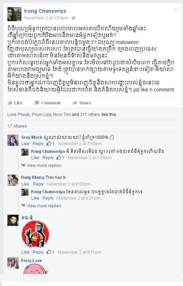 ក្នុងនោះមានអ្នកលេង Facebook ម្នាក់ទៀត ត្រូវគេស្គាល់ថាជា អតីតតារាសម្តែង នាង គង់ ចាន់សូរិយា ក៏បានបញ្ចេញសាររិះគន់ថា «ពិធីបុណ្យអុំទូក ត្រូវបានលុបចោលអស់៣លើកហើយរួមទាំងឆ្នាំនេះ តើឆ្នាំក្រោយពួកយើងអាច នឹងមានអុំទូកទៀតឬអត់? ឬក៏គេចង់បំភ្លេចពិធីនេះ ចោលបន្ដិចម្ដងៗ? ឯបុណ្យ Halloween វិញជាបុណ្យរបស់គេសោះ តែត្រូវបានធ្វើយ៉ាងគគ្រឹកគ្រេង ពេញប្រទេស ជោរតាមសាសន៍គេ មិនមែនជំទាស់នឹងទស្សនៈ ឬការកំសាន្ដរបស់អ្នកទាំងអស់គ្នាទេ តែមើលទៅវាដូចជាសំបើមពេក ធ្វើតាមក្លឹប តាមហាងវាមធ្យមទេ តែងំត្រូវបានចាក់ផ្សាយតាមទូរទស្សន៍នានាទៀត។ អីយ៉ាហេ..! អីក៏យ៉ាងហ្នឹងស្រុកខ្ញុំ។ មិនខ្វល់ថា អ្នកណាពេញចិត្ត ឬមិនពេញចិត្តនឹងសារបង្ហោះរបស់ខ្ញុំមួយនេះទេ តែសំខាន់ គឺចង់និយាយអ្វីដែលជាការពិត និងគំនិតរបស់ខ្ញុំ....»។