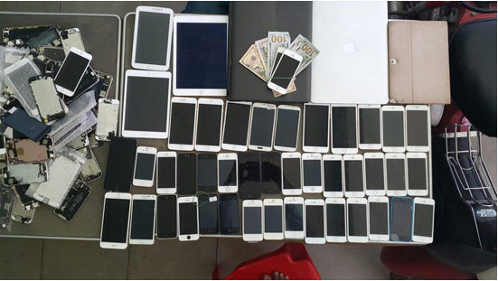 ដោយឡែកវត្ថុតាងចាប់បាន ទូរស័ព្ទ ៤០គ្រឿង ម៉ាក I phone 6 plus ៧គ្រឿង, I phone 6 ៣គ្រឿង, I phone 5s ៧គ្រឿង , I phone 5s ៩គ្រឿង , I phone 5c ២គ្រឿង , I phone 4s ៥គ្រឿង និង I phone ១គ្រឿង។ កុំព្យូទ័រ យួរដៃ ( ឡេបថប ) ២គ្រឿង ម៉ាក aser ១គ្រឿង និងម៉ាក Apple macbook ១គ្រឿង , I pad ២គ្រឿង ម៉ាក i padmini ១គ្រឿង និងម៉ាក air 2 ១គ្រឿង , Samsung Tap 10.1 ១គ្រឿង, ម៉ូតូមួយគ្រឿងម៉ាក Little Cub ពណ៌ក្រហម ពាក់ស្លាកលេខភ្នំពេញ 1BP-9829 និង លុយចំនួន ៣៨០ដុល្លារ៕