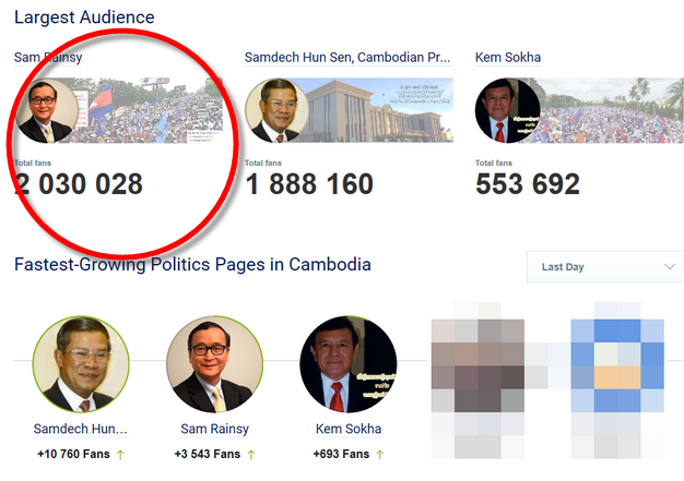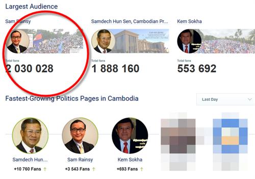គិតមកត្រឹមយប់ថ្ងៃសៅរ៍នេះ Facebook លោក សម រង្ស៊ី មានចំនួនជាង២លាននាក់, Facebook សម្តេចតេជោ ហ៊ុន សែន មានចំនួនជិត២លាននាក់ និងលោក កឹម សុខា មានចំនួនជាងកន្លះលាននាក់តែប៉ុណ្ណោះ៕