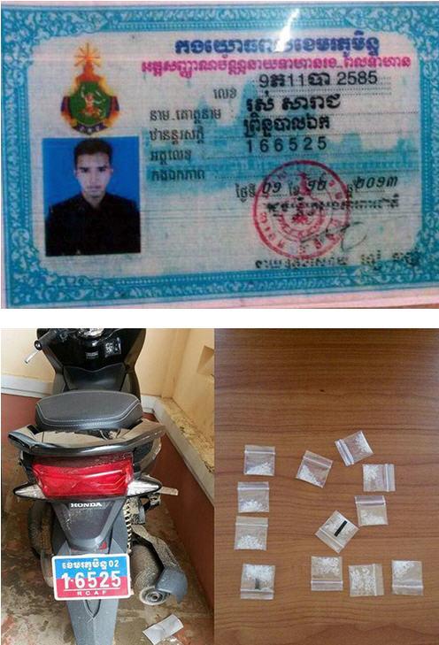 លោកបានបន្តថា ជនសង្ស័យឈ្មោះរស់ សារាជ ភេទប្រុស អាយុ២២ឆ្នាំ ជនជាតិខ្មែរ ស្នាក់នៅមិន ប្រាកដ បំរើការងារនៅអង្គភាព វរសេនាតូចលេខ513 កងពលតូចលេខ51 ស្នាក់នៅបន្ទាយថ្មសិន ខេត្តបន្ទាយមានជ័យ ក្នុងនោះសមត្ថកិច្ចយើង បានដកហូត បានគ្រឿងញៀនប្រភេទមេតំហ្វេតាមីន អាយចំនួន១២ថង់តូច ម៉ូតូ១ គ្រឿងម៉ាកសីភីអិច ពាក់ស្លាកលេខ លេខខ.ម6525។
