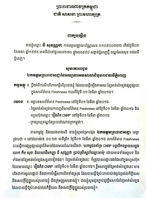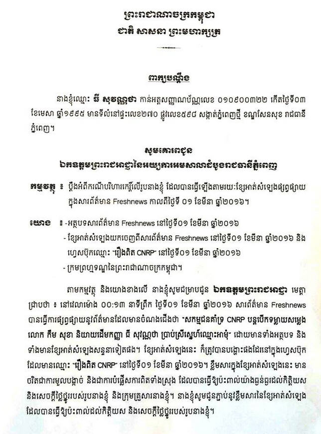 កញ្ញា ធី សុវណ្ណថា កាលពីល្ងាចថ្ងៃទី០១ ខែមីនា ឆ្នាំ២០១៦ បានដាក់ពាក្យបណ្ដឹងជាផ្លូវការទៅកាន់សាលាដំបូងរាជធានីភ្នំពេញ ពាក់ព័ន្ធសារសំឡេងបរិហាកេរ្តិ៍នាង ចេញពីខ្សែអាត់សំឡេងមួយ ដែលបែកធ្លាយនៅលើបណ្តាញសង្គម Facebook និងសារព័ត៌មាន។ នៅក្នុងលិខិតពាក្យបណ្តឹងរបស់កញ្ញាបានបង្ហាញថា៖ ខ្លឹមសារក្នុងខ្សែអាត់សម្លេងនោះ (ខ្សៃអាត់សម្លេងឆ្លងឆ្លើយដែលគេជឿថាជាលោក កឹម សុខា និងយុវតីម្នាក់) មានចរិតជាការមួលបង្កាច់ និងជាការបំផ្លើសការពិតទាំងស្រុង ដែលបានធ្វើឲ្យប៉ះពាល់យ៉ាងធ្ងន់ធ្ងរដល់កិត្តិយស និងសេចក្តីថ្លៃថ្នូរបស់រូបនាង។