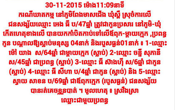 កំពង់ចាម៖ ឃាតកម្មដ៏ឃោរឃៅមួយ បានកើតឡើងក្នុងគ្រួសារ បណ្តាលស្លាប់៤នាក់ និង១នាក់របួសធ្ងន់ ដោយសារ បុរសជាប្តី ផឹកសា្រស្រវឹង សម្លាប់ទាំងម៉ែក្មេក ប្រពន្ធ កូននិងឪពុក្មេង (របួសធ្ងន់) កាលពីវេលាម៉ោង ១១យប់ថ្ងៃ ទី៣០ ខែវិច្ឆិកា ឆ្នាំ២០១៥ ។