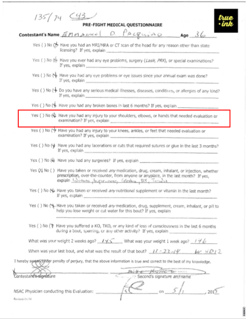 ព័ត៌មានកីឡា៖ យោងតាមការចុះផ្សាយរបស់ គេហទំព័រ boxingscene បានលាតត្រដាងឲ្យដឹងថា ប៉ាក់គីអៅ ពិតជាមិនបានបំពេញ លើសំណួរដែលត្រូវបានគេសួរទាក់ទងនឹង បញ្ហាសុខភាពរបស់ខ្លួនមែន កាលពីមុនពេលប្រកួត ។ ដោយហេតុការណ៍ ឆ្លើយតបទៅនឹង កម្រងសំណូរដែលបានលើកឡើង នោះគឺ កីឡាករ បានបដិសេធនឹង មុខសញ្ញារជម្ងឺដែល ខ្លួនកំពុងតែកើតមានពិតប្រាកដ ។ កាន់តែច្បាស់ សូមពិនិត្យមើលទៅសំណួរទី ៦ ដែលត្រូវបានគេសួរថា "តើអ្នកមានរបួសផ្សេងៗលើរាងកាយរបស់អ្នក ដូចជា ស្មា កែងដៃ រឺក៏ដៃដែលត្រូវធ្វើការពិនិត្យនិង វិភាគដែរ ឬទេ?" ចំលើយរបស់កីឡាករគឺមិនមាននោះទេ (No) ។ ទស្សនារូបភាពខាងក្រោម ៖