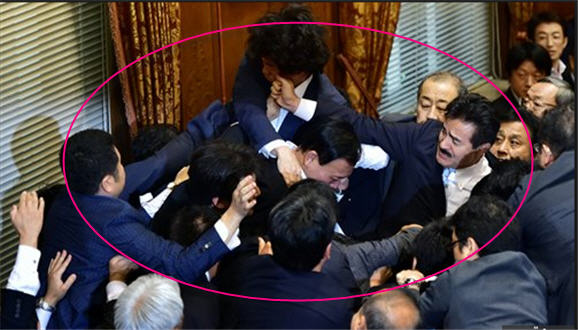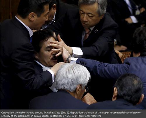 គួររំឮកថា អង្គប្រជុំផ្លូវការ នៅសភាជាន់ខ្ពស់ អំឡុងថ្ងៃព្រហស្បត្តិ៍ មានបញ្ហាប្រឈមជាខ្លាំង រវាង ក្រុមអ្នកគាំទ្រ ច្បាប់យោធាថ្មី និងក្រុម មិន គាំទ្រ ច្បាប់ យោធា ថ្មីរបស់ប្រទេសជប៉ុនលើកនេះ ដោយ ឈានទៅដល់ ភាពចម្រូវចម្រាស់ ប្រតាយប្រតប់គ្នា ពេញអង្គប្រជុំសភាជាន់ខ្ពស់ តួយ៉ាង ក្រុមអ្នកគាំទ្រ និង ប្រឆាំង បានប្រតាយប្រតប់គ្នា ស្របពេលដែល វត្តមាន ប្រធានគណៈកម្មការ ត្រូវបានឡោមព័ន្ធ ។ មិនត្រឹមតែប៉ុណ្ណោះ ក៏មានករណីបិទទ្វារ សំណង់អាគារ សភាជាន់ខ្ពស់ ដូច គ្នាដែរ ពីសំណាក់ក្រុមប្រឆាំងច្បាប់យោធា ។