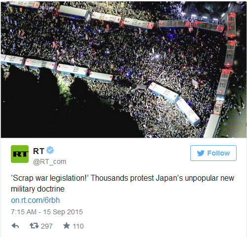 គួររំឮកថា មានករណីផ្ទុះការតវ៉ា ទ្រង់ទ្រាយធំ នៅតាម បណ្តោយ ផ្លូវក្នុងទីក្រុង តូក្យូ ប្រឆាំងទៅ នឹងច្បាប់យោធាថ្មី របស់ប្រទេសជប៉ុន ពីមុខសំណង់អាគារ សភាជាតិ ពោលជា ការតវ៉ា ប្រឆាំង ទៅនឹងច្បាប់យោធាថ្មីមួយនេះ អនុញ្ញាតអោយ កងទ័ពជប៉ុន ចូលដៃ ប្រយុទ្ធនៅបរទេសជាលើក ដំបូង ចាប់តាំងពីសង្គ្រាមលោកលើកទី២ ។