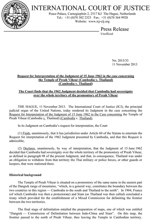 ភ្នំពេញ ៖ តាមការបញ្ជាក់នៃការបក ស្រាយសាលដីកា របស់តុលាការអន្ដរជាតិ ទីក្រុងឡាអេ